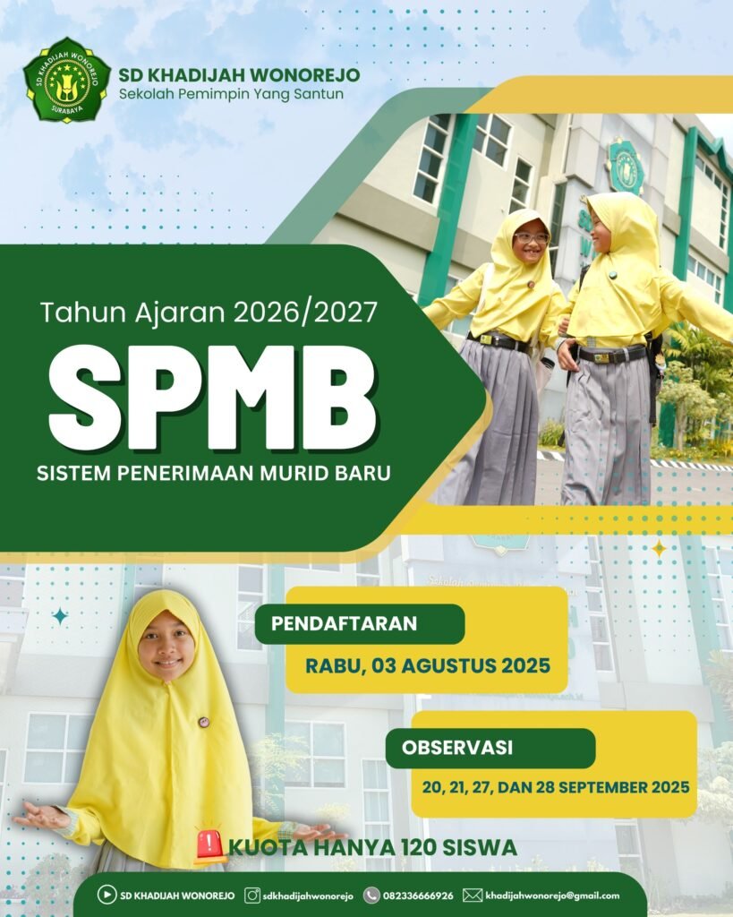 Enroll your child at SD Khadijah Wonorejo, a modern Islamic elementary school in Surabaya. Discover our vibrant learning environment.